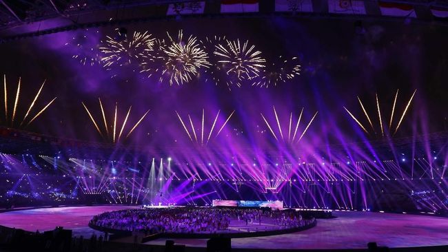 Upacara penutupan Asian Games 2018 di SUGBK. (REUTERS/Darren Whiteside)Lewat sambungan teleconference di sela upacara penutupan Asian Games 2018, Jokowi meminta maaf karena tidak bisa hadir di SUGBK karena sedang mengunjungi korban gempa di Lombok, Nusa Tenggara Barat.